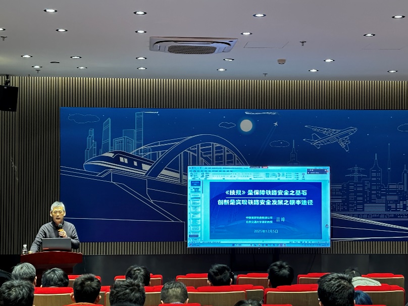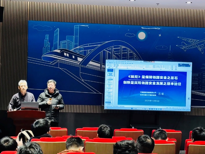 2025年12月5日下午,由铁路运输组织课程群虚拟教研室主办的学术讲座“《技规》是保障铁路安全的基石,创新是铁路安全发展的根本途径”在北京交通大学运输设备教学馆报告厅成功举办,讲座采用“线上+线下”相结合的方式。本次讲座由中国国家铁路集团有限公司“百千万人才”工程专业领军人物、中国铁路总公司首届“百千万人才”工程专业带头人、北京交通大学兼职教授吕峰正高工主讲,国家级虚拟教研室负责人何世伟教授主持,线上线下100余名校内外师生参加了此次活动。